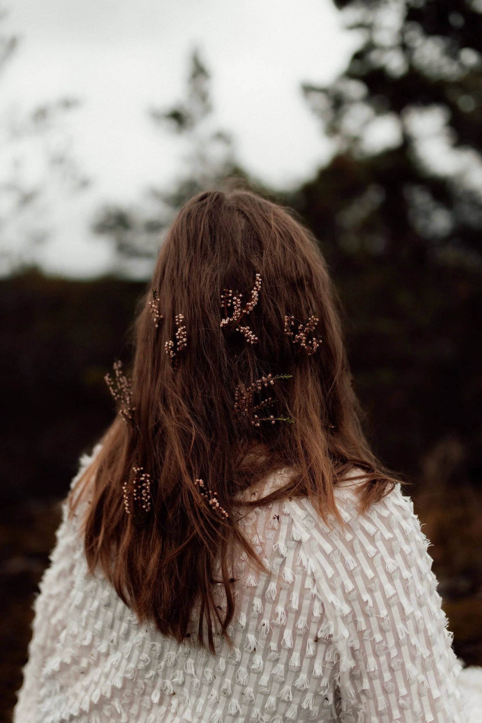 Naisen ylävartalo takaapäin kuvattuna, hiuksissa kanervan kukkia.